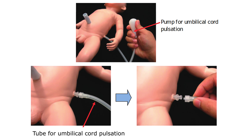 Moreover, by releasing the connector on the left flank of the model, the tube for umbilical cord pulsation can be removed. Please remove the tube when it is not needed.